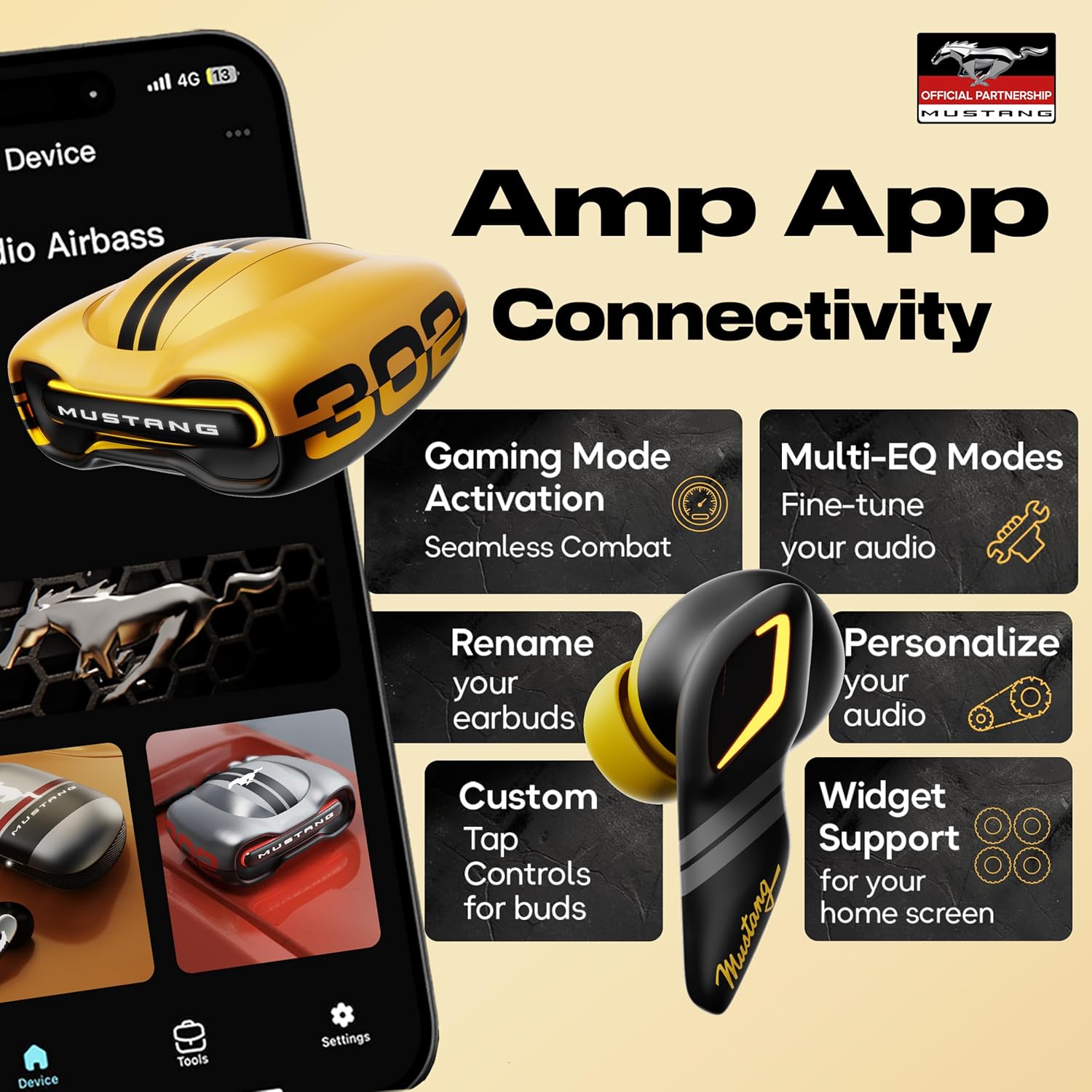 - App Support, Quad Mic ENC, 45ms Low Latency, 13mm Driver, Breathing LEDs,Touch Controls, Made in India, IPX5, Ear buds Wireless (Yellow) ✅Boult X Mustang Collaboration: Experience the ultimate fusion of world-class design, advanced tech, and exhilarating speed. Inspired by the Ford Mustang, these earbuds deliver iconic aesthetics with cutting-edge audio performance.